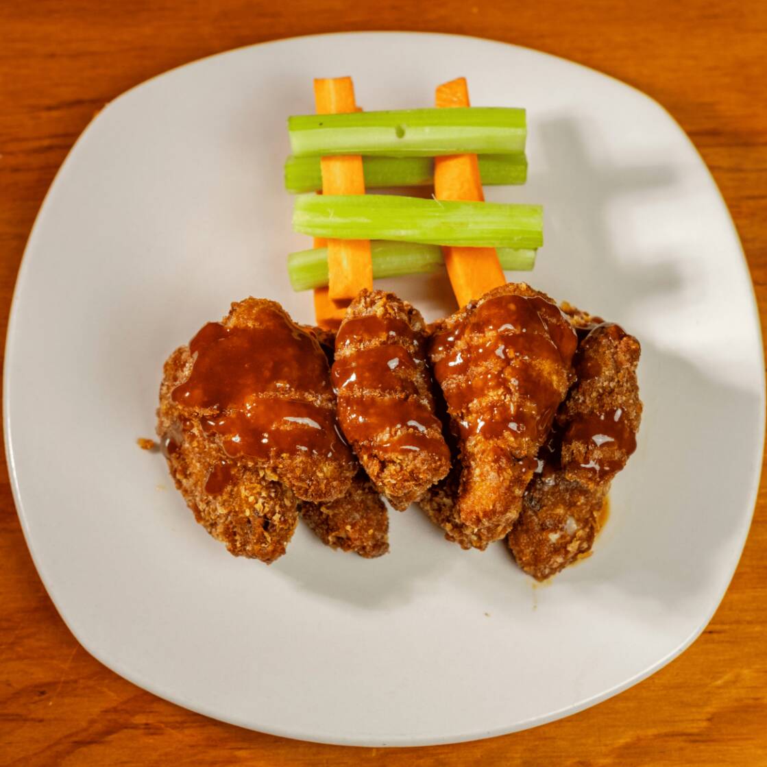 Alitas apanadas en panko acompañadas de apio , zanahoria en bastones y salsa humo x + gaseosa 1.5 litros.