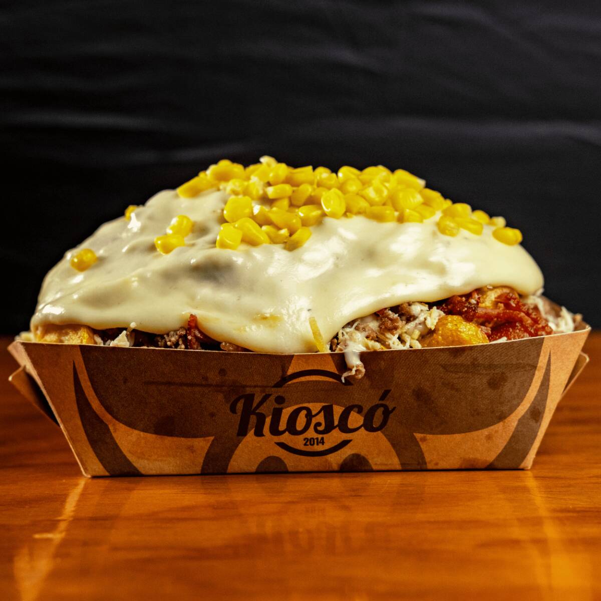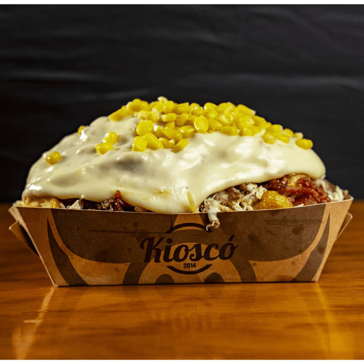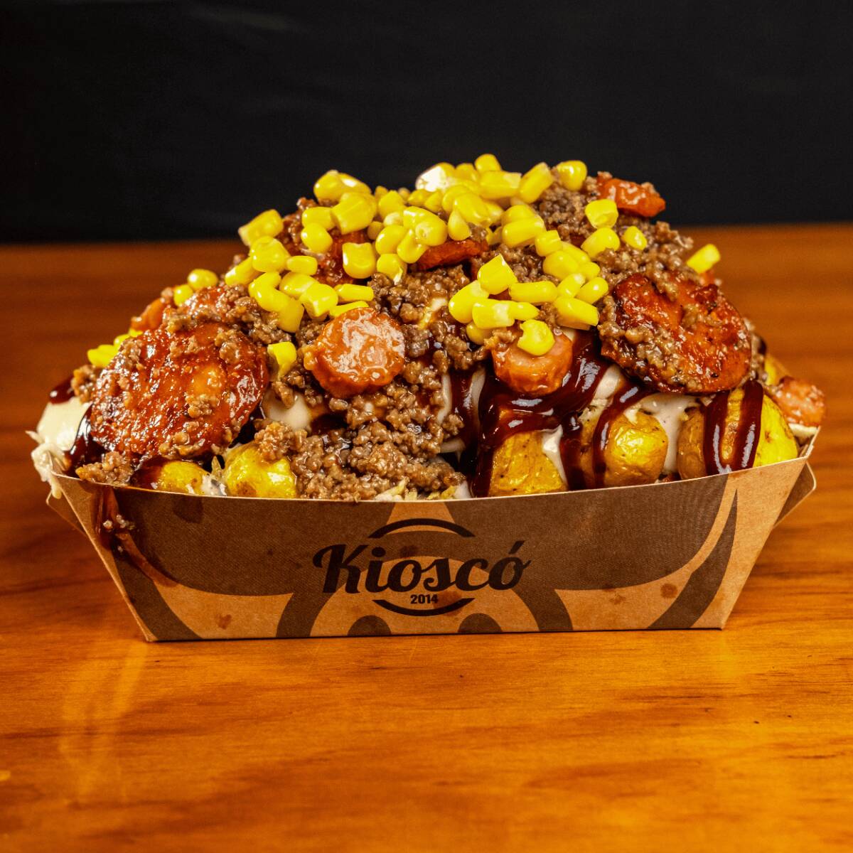 Salchipapa personal con carne molida, ranchera, queso mozzarella, chorizo de la casa, maíz y ripio, acompañada de gaseosa de 250 ml (sabor y marca disponibles en tienda).