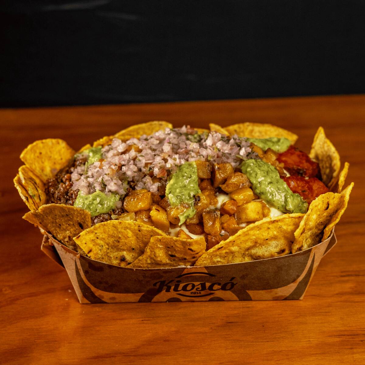 Salchipapa especial para 2 o 3 personas con un toque picante, carne molida hot, guacamole, chorizo de la casa, maduro, pico de gallo y nachos + 2 gaseosa 250ml.