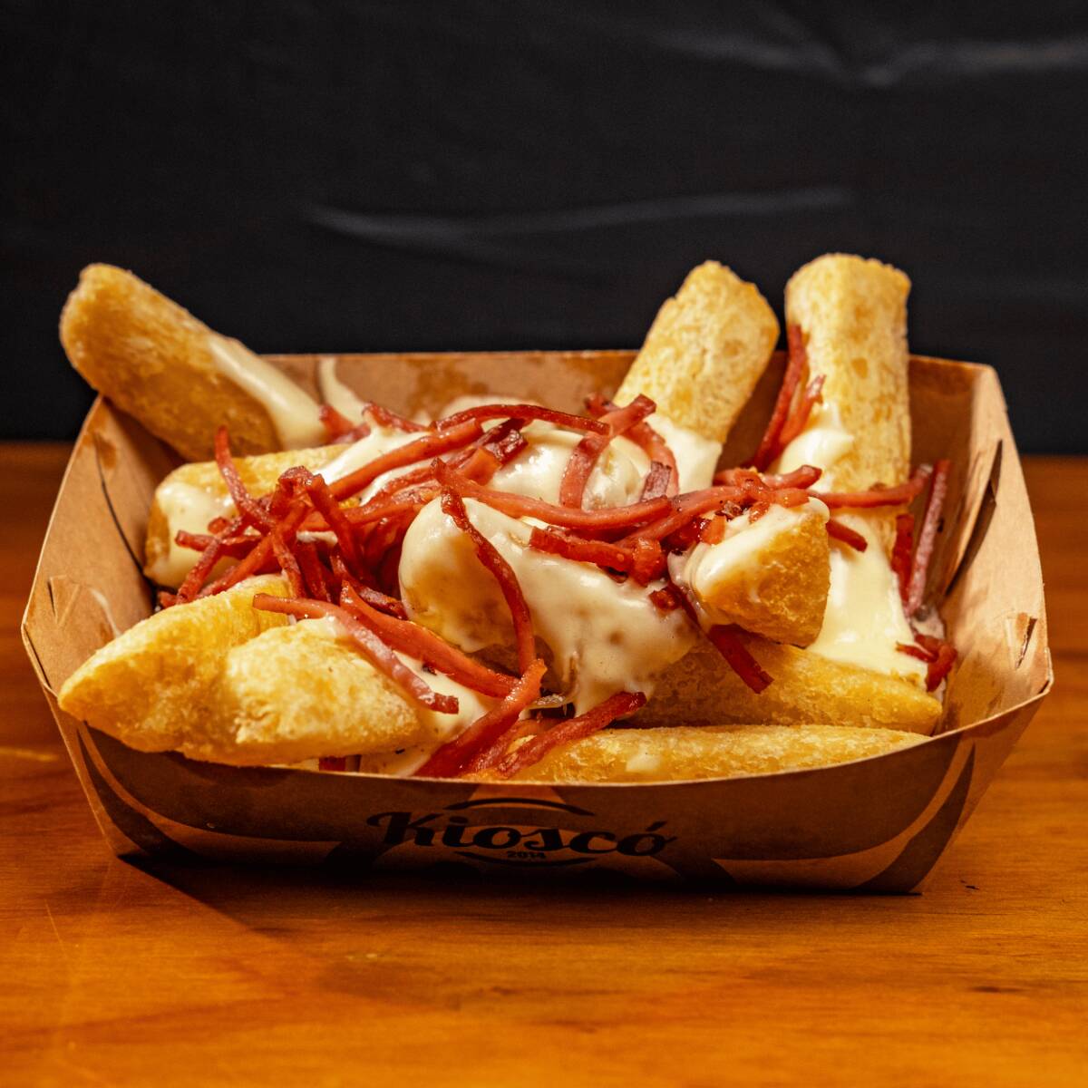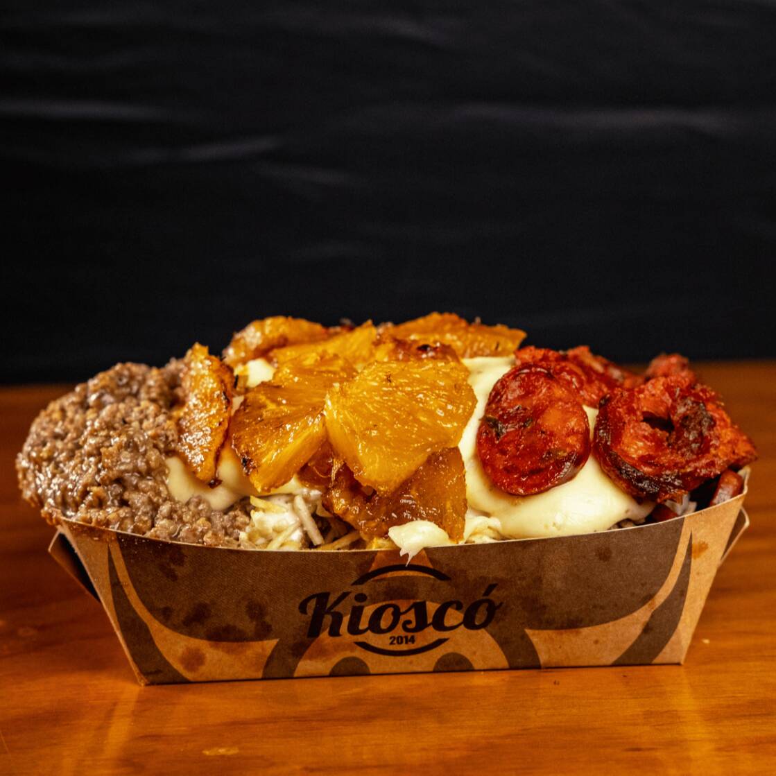 Platillo personal. Deliciosa combinación de aproximadamente 80 g de salchicha, 120 g de papas casco (criolla), papas ripio, queso mozzarella fundido y costilla BBQ suave y jugosa. Empacado en icopor para domicilio.