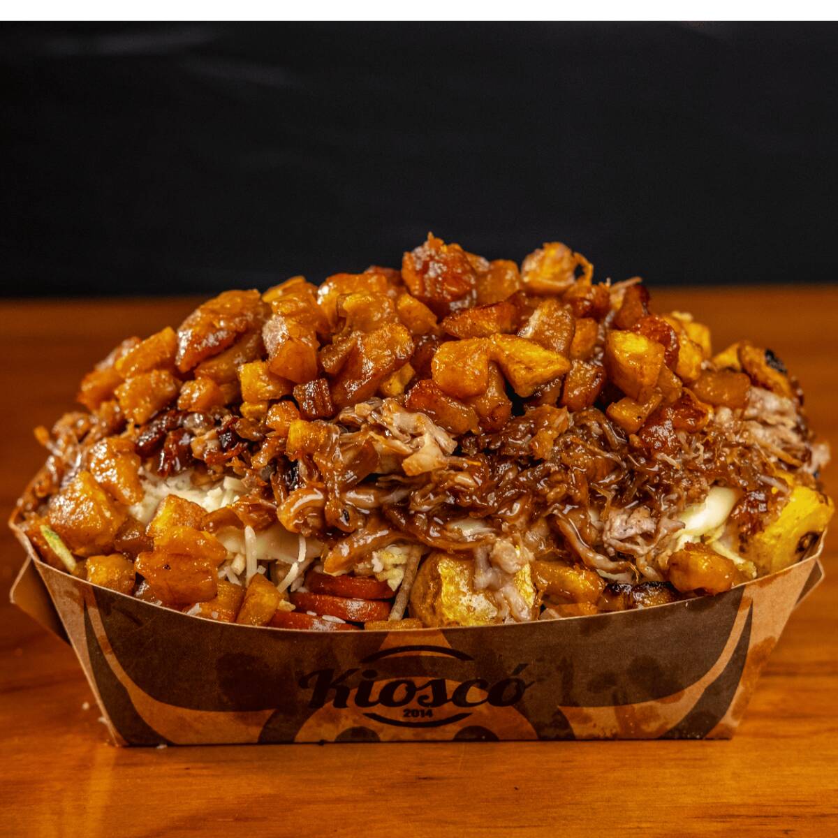 Salchipapa personal con pulled pork, queso mozarella, maduro, parmesano + gaseosa 250ml.