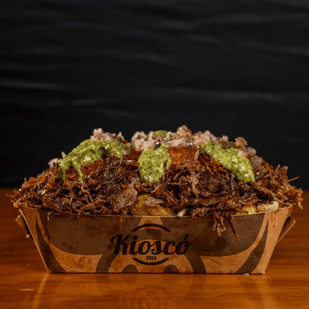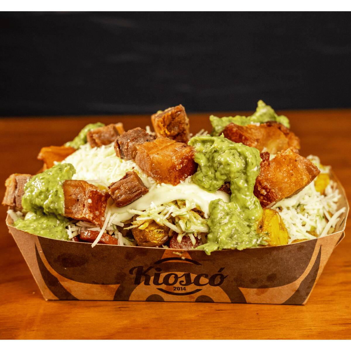 Salchipapa especial para 2 o 3 personas con chorizo de la casa, maduro, carne desmechada, pulled pork, guacamole, pico de gallo, queso mozzarella + 2 gaseosa 250ml.