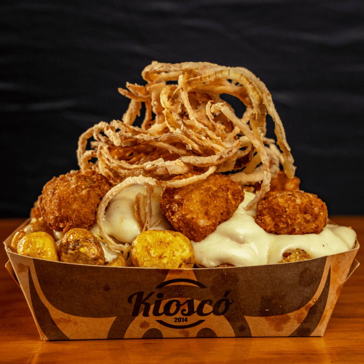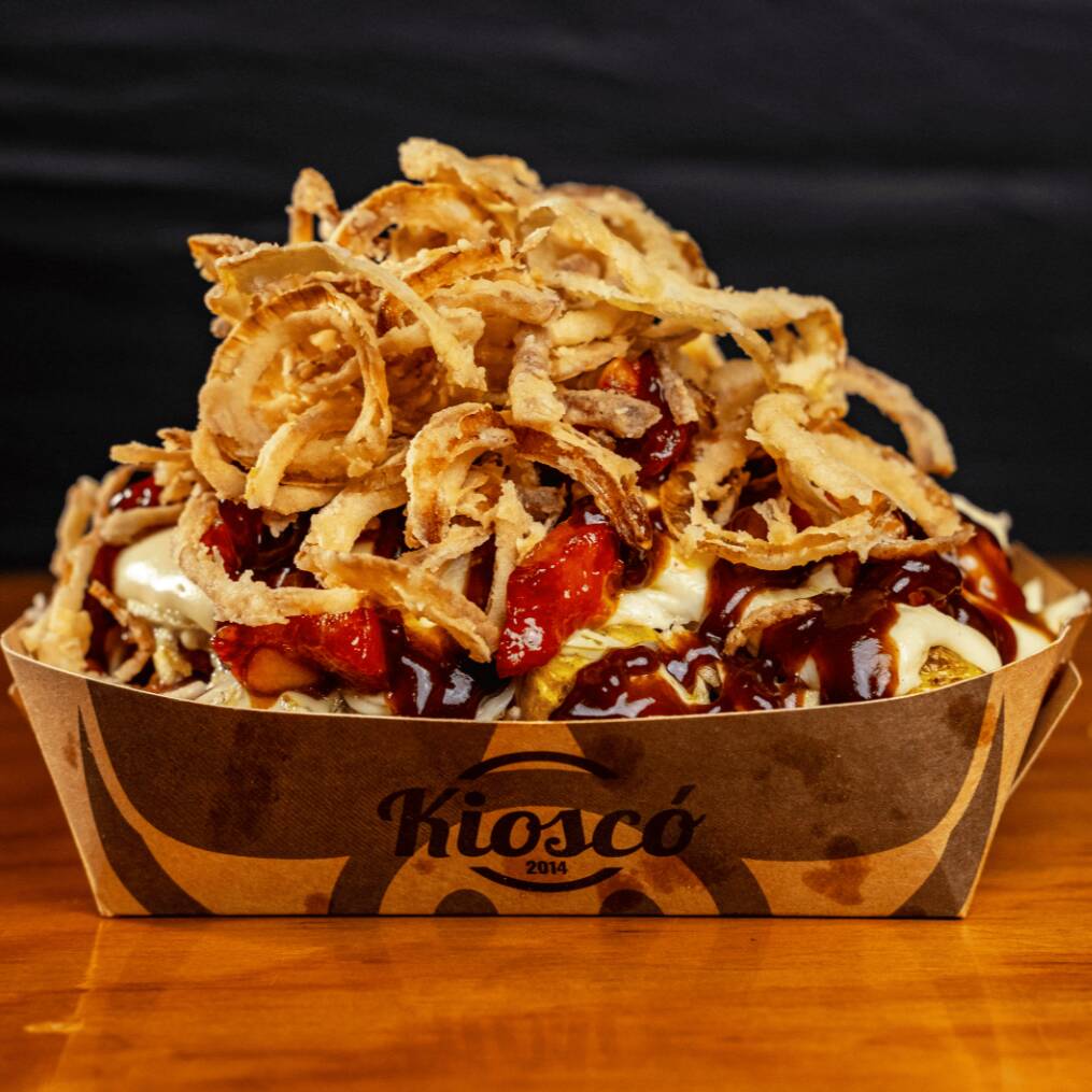 Salchipapa personal con costilla bañada en bbq, queso mozarella, ripio y cebolla crispy + gaseosa 250ml.