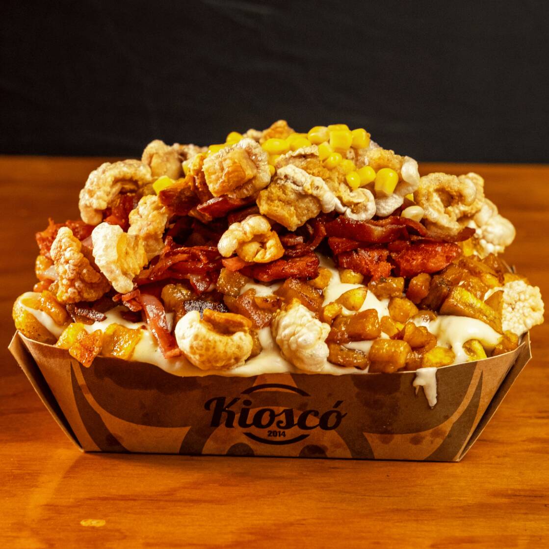 salchipapa especial para 2 o 3 personas con chorizo de la casa, maduro, tocineta, chicharrón crocante, maíz, ripio, queso mozzarella + 2 gaseosa 250ml.
