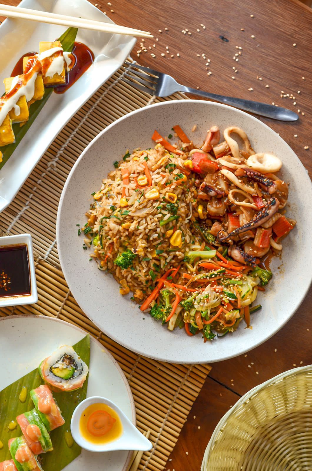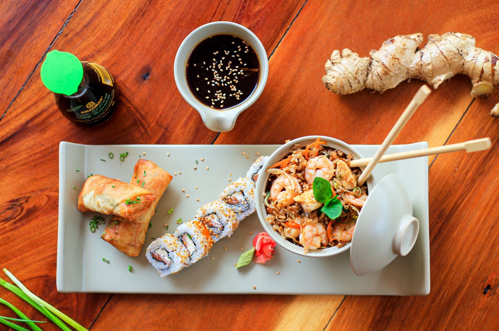 Yakimeshi de pollo y camarón, acompañado de 2 harumakis veggie y 5 bocados de sushi filadelfia