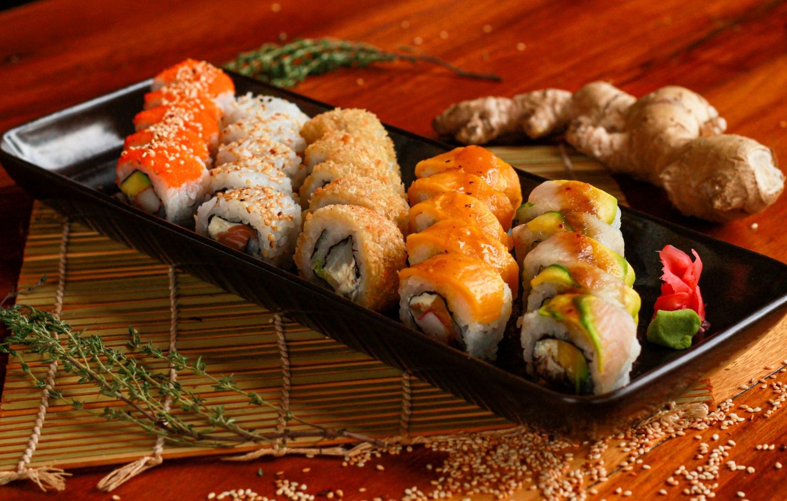 Salmón fresco y queso crema, cobertura de ajonjolí.
