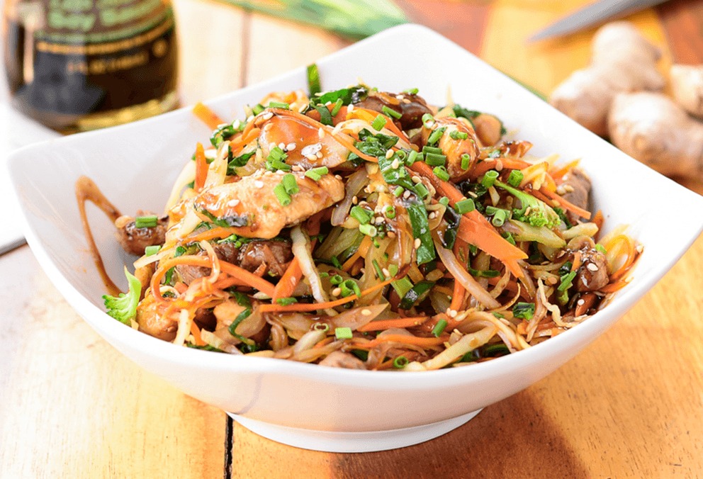 Trocito de pollo, lomo viche y camarón, salteados al estilo japones en salsa soya, pídelo en yakimeshi, yakisoba o yasaitame
