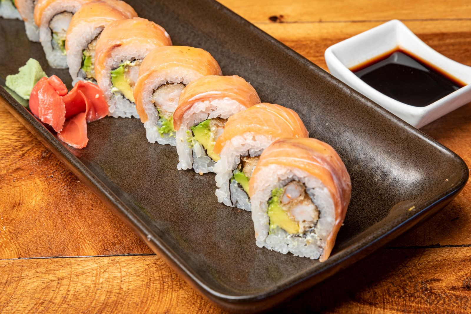 salmón fresco, queso crema, aguacate, skin de salmón, topping de salmó fresco y aguacate..