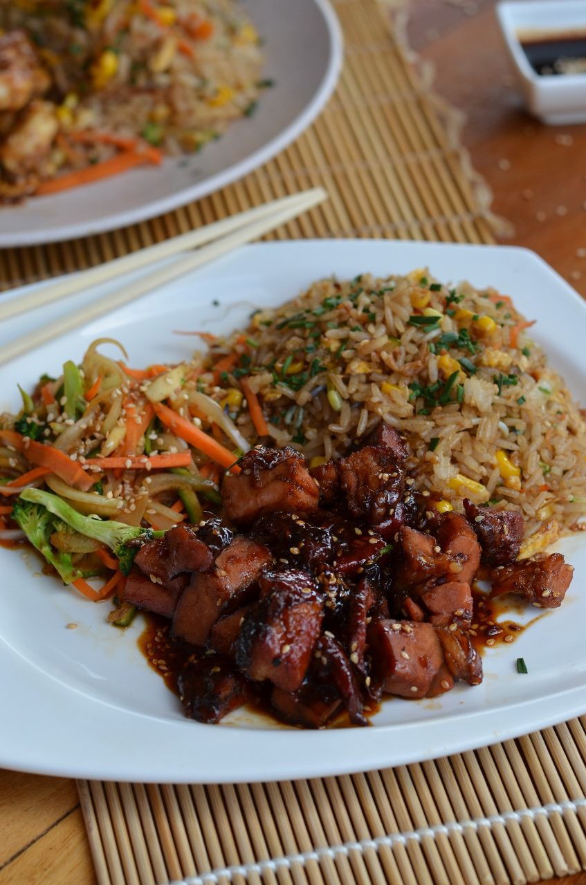 Trocitos de lomo viche, castilla ahumada y pollo salteados en salsa teriyaki, acompañado de yakimeshi con camarón