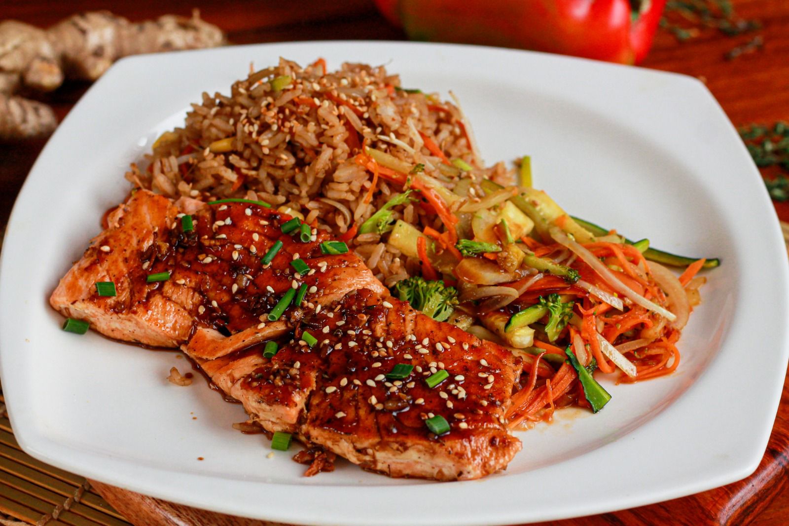 Salmon salteado en salsa teriyaki. elige dos acompañamientos entre yakimeshi, yasaitame o papas a la francesa