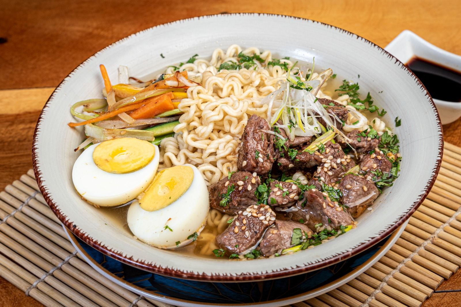 Sopa japonesa, acompañada de pasta, huevo cocido, vegetales salteados y proteína a elección.