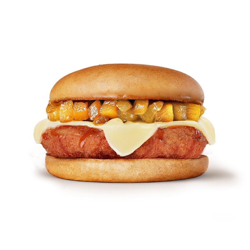 Hamburguesa filete relleno con piña caramelizada, acompanada de 90 gr de papas a la francesa y gaseosa de 400 ml