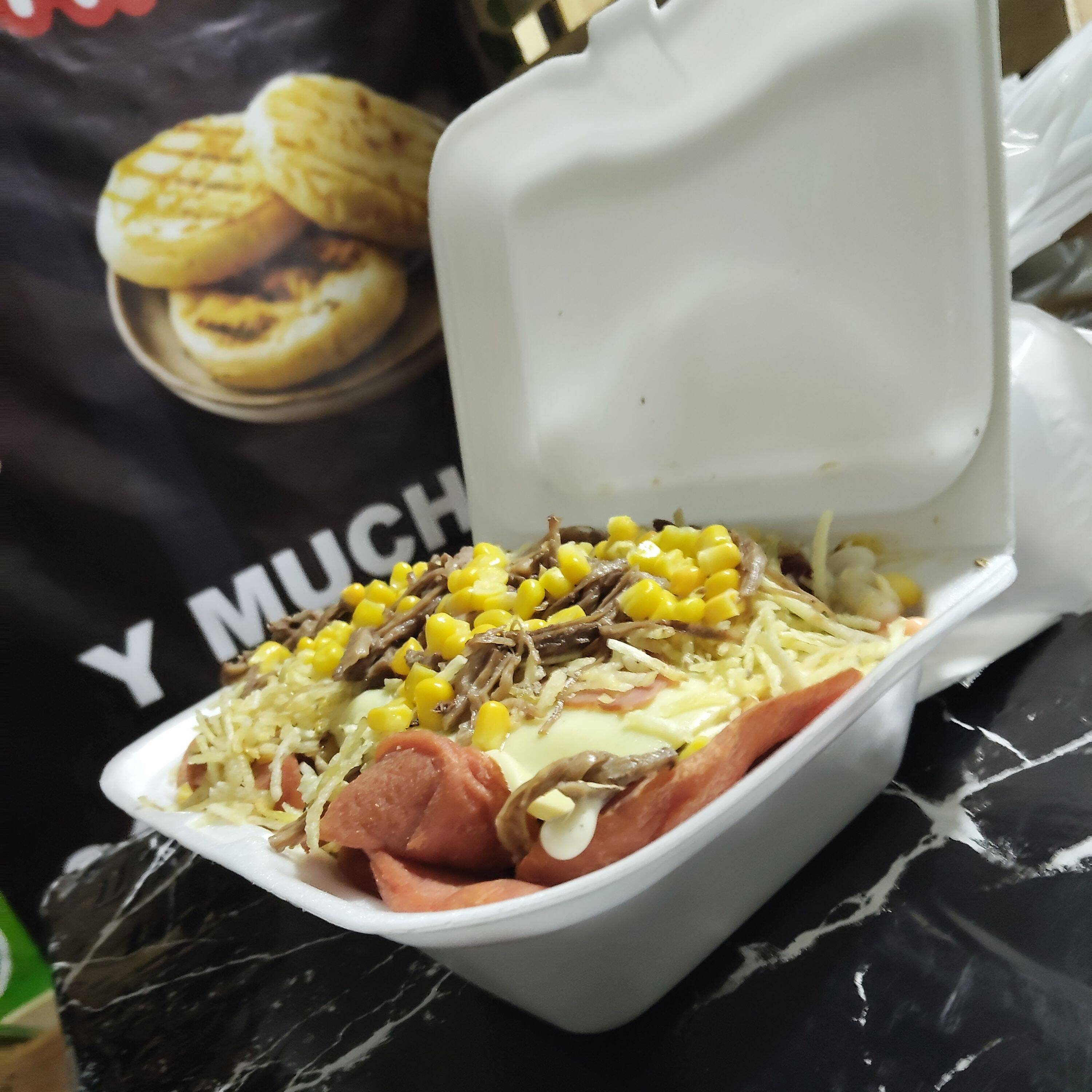 para 2 personas contiene papa francesa,salchicha,trozos de pollo ,queso,ripio, tocineta, maicito