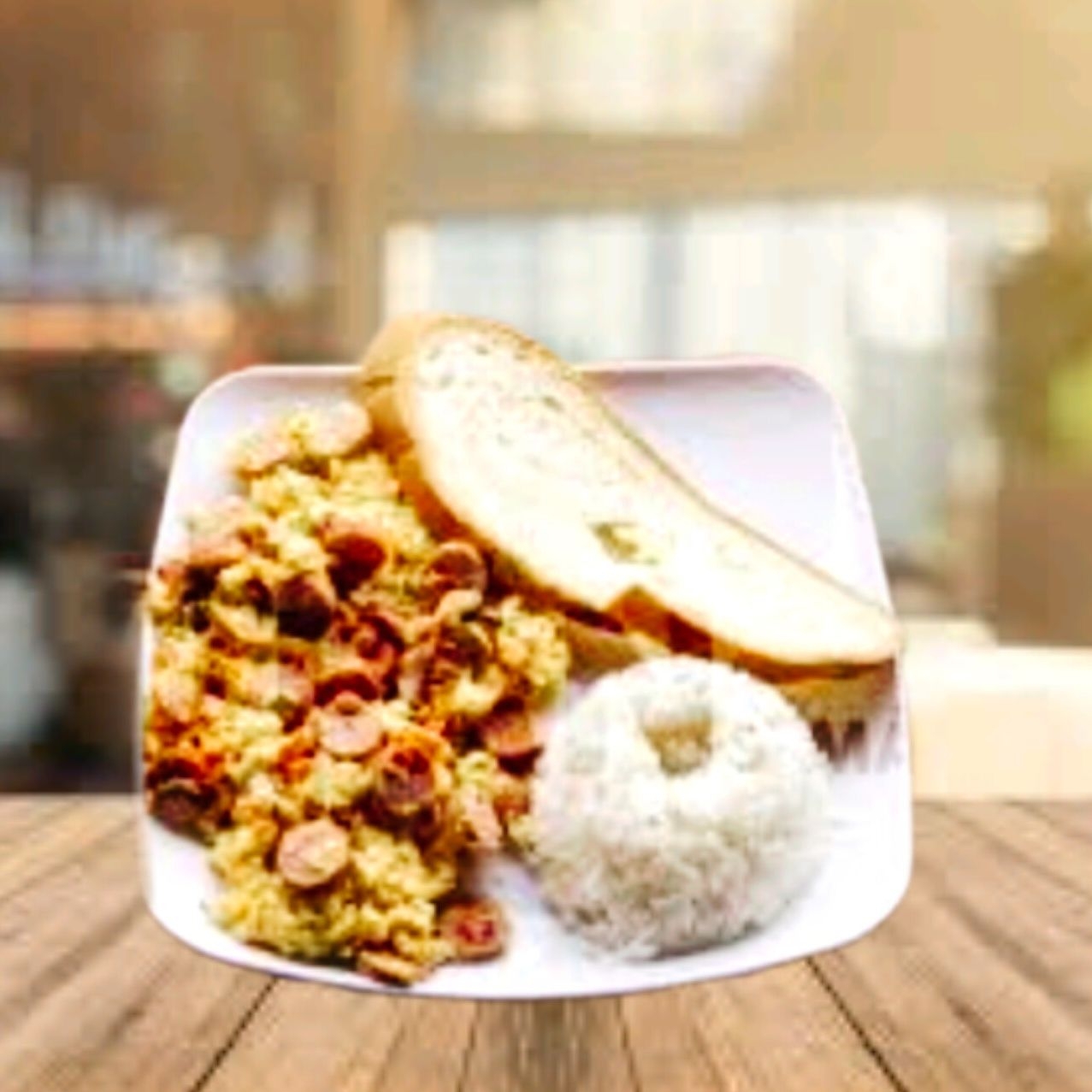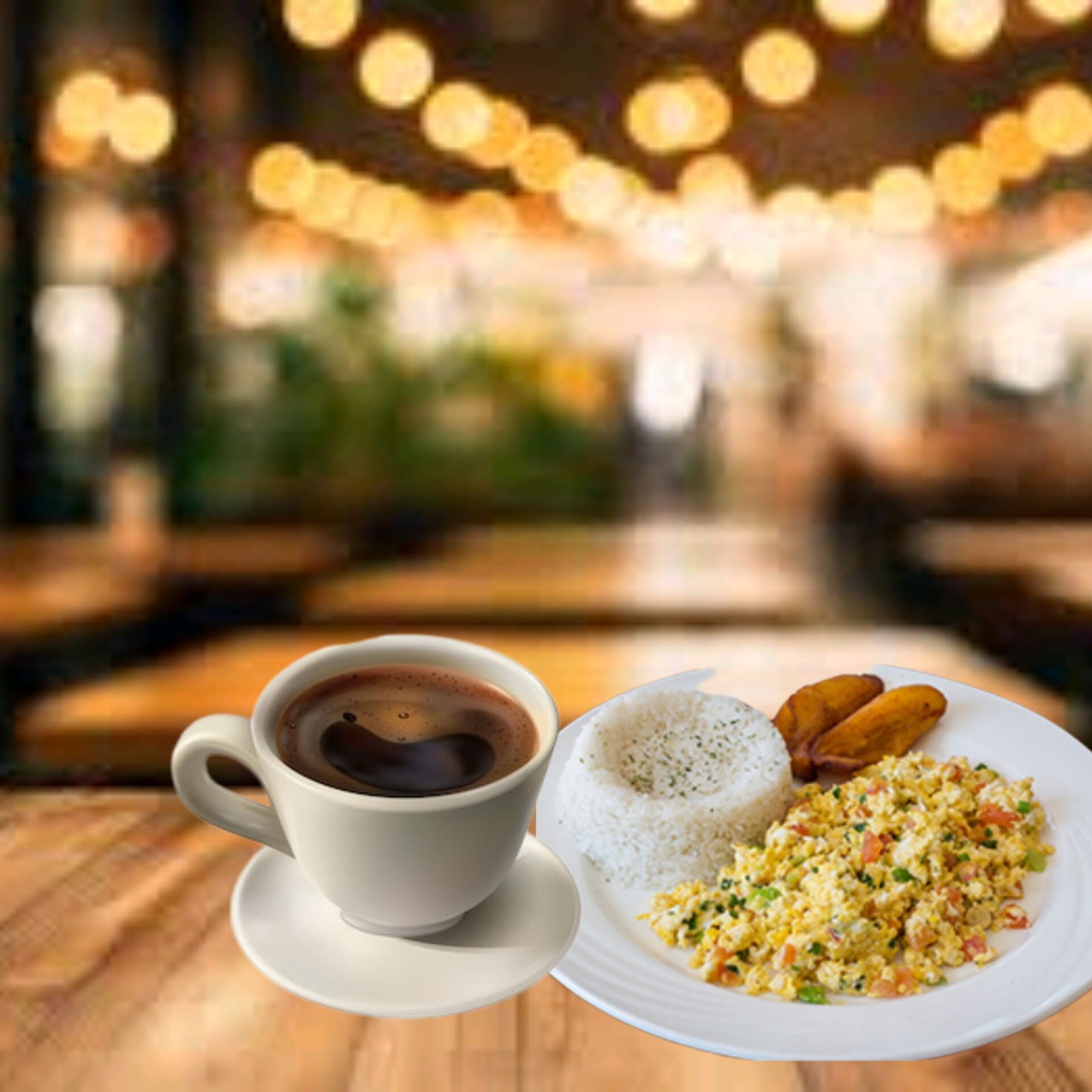 arroz , Huevos Rancheros con pan y vaso de Cafe