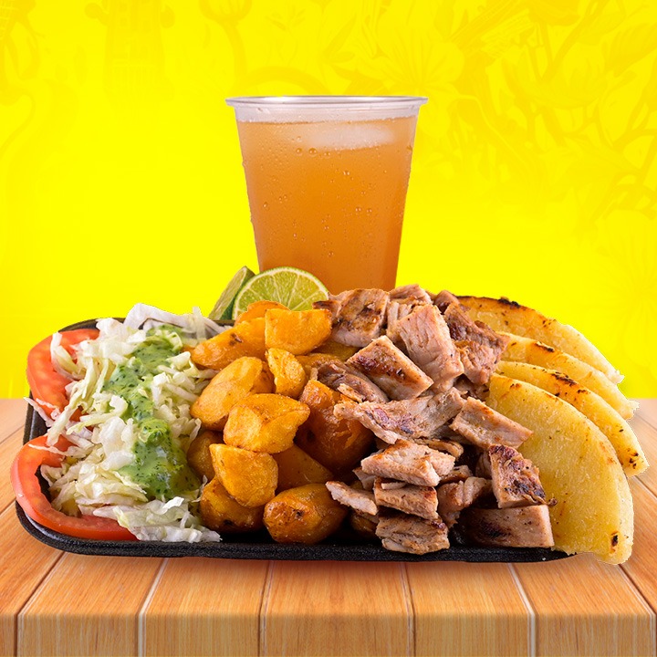 1 Arepa con pollo desmechado, carne desmechada, chicharrón crujiente, lechuga y tomate fresco + 1 porción de papas + 1 agua panela
