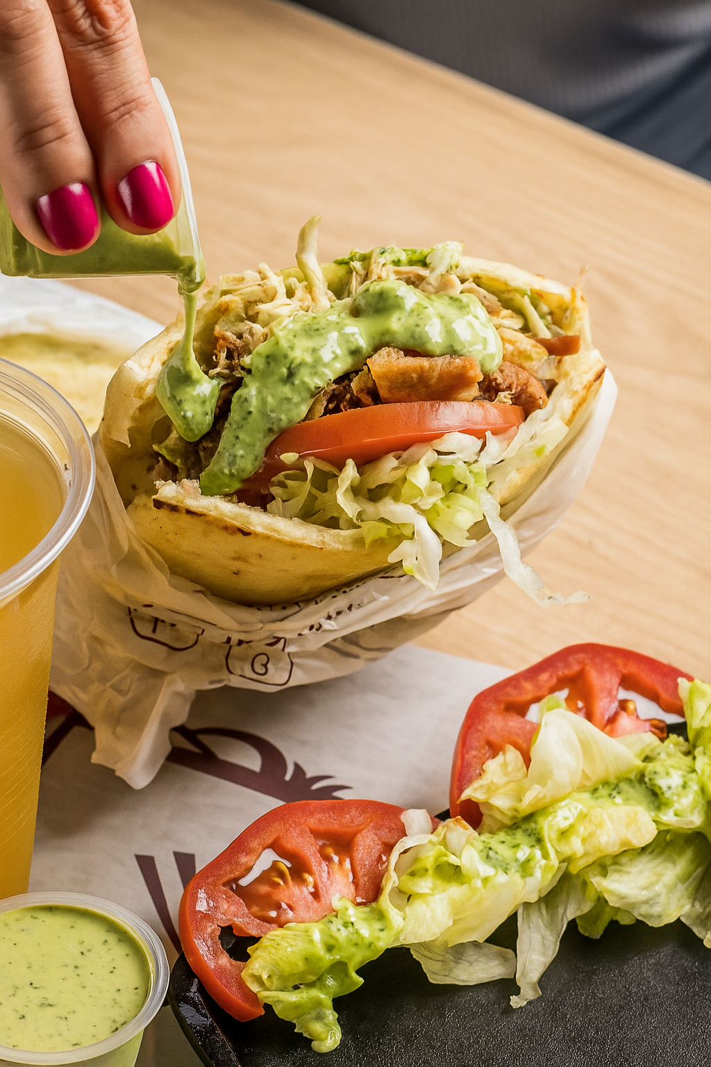 1 Arepa con pollo desmechado, carne desmechada, chicharrón crujiente, lechuga y tomate fresco + 1 agua panela