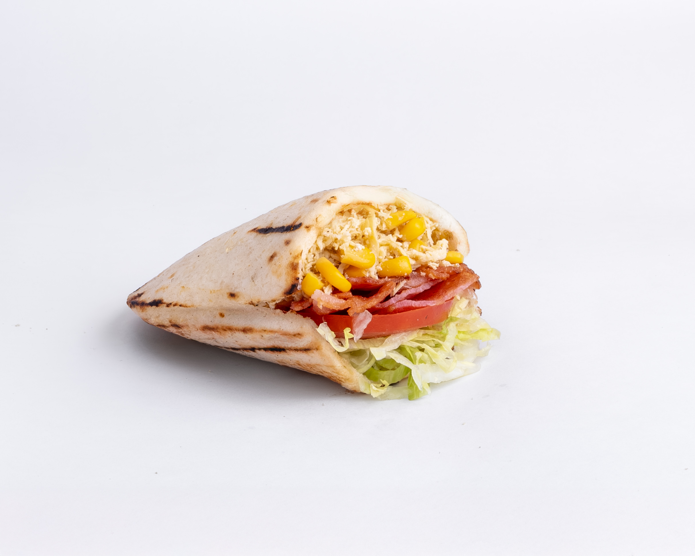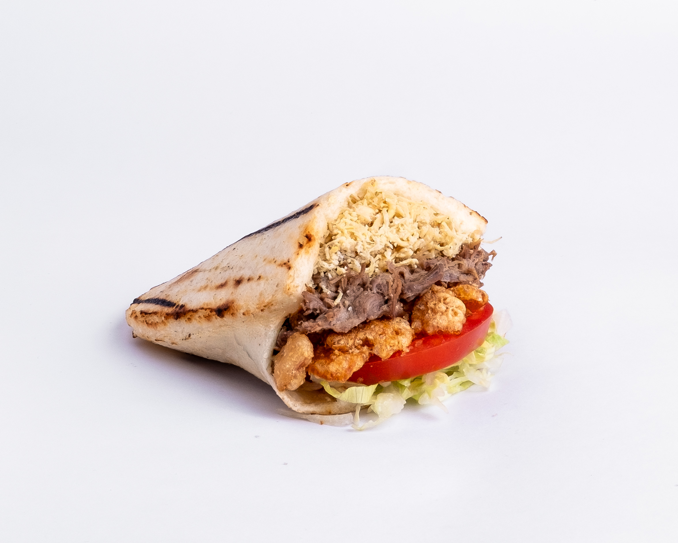 Arepa con pollo desmechado y verduras frescas.