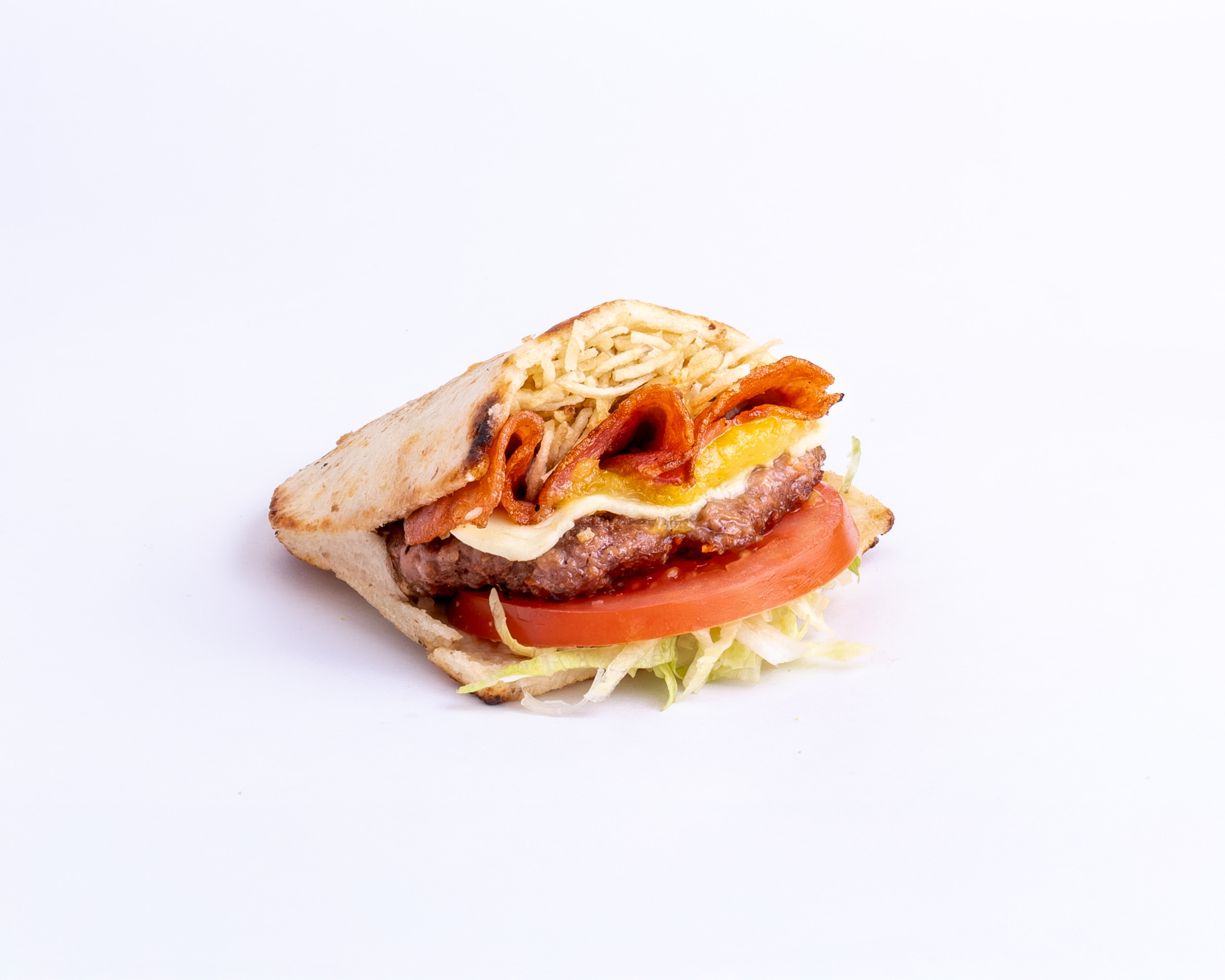 Arepa con carne hamburguesa, ripio de papa, tocineta, queso, salsa verde y verduras frescas.