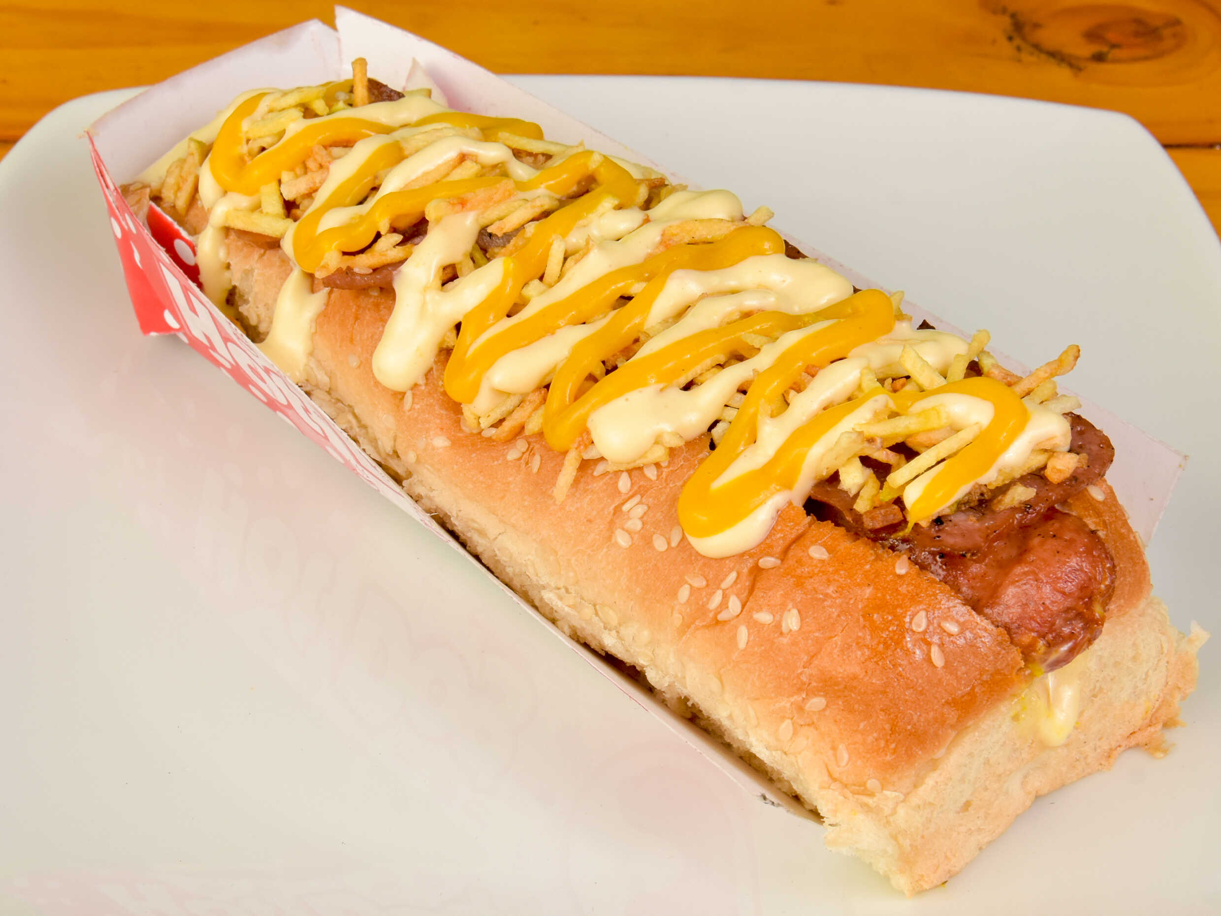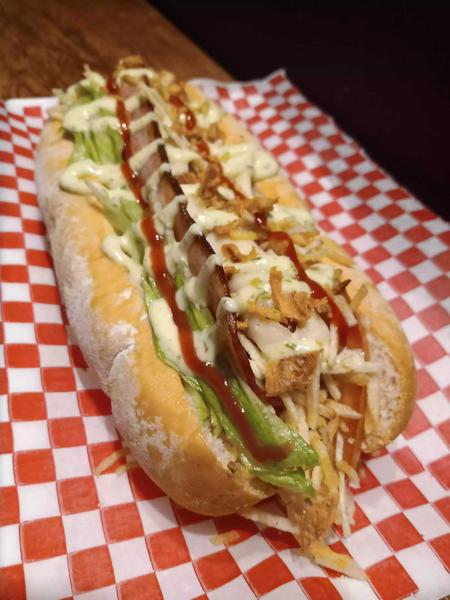 Pan, salchicha, tocineta y ripio de papa, cubierto de queso.