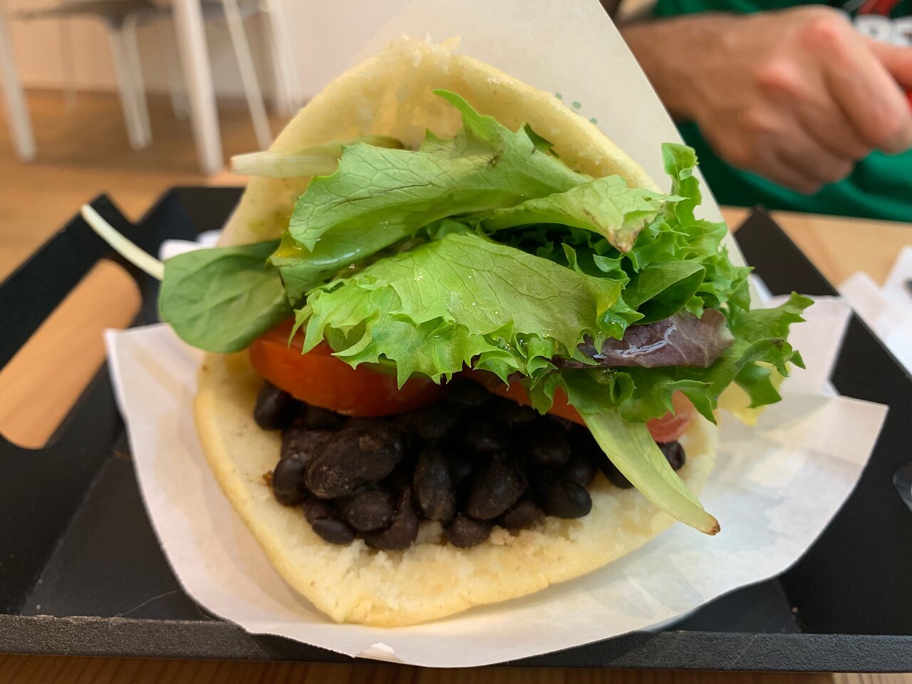 Arepa de maíz, rellena de lechuga batabia, cebolla, tomate, queso, maicitos y ripio de papa.