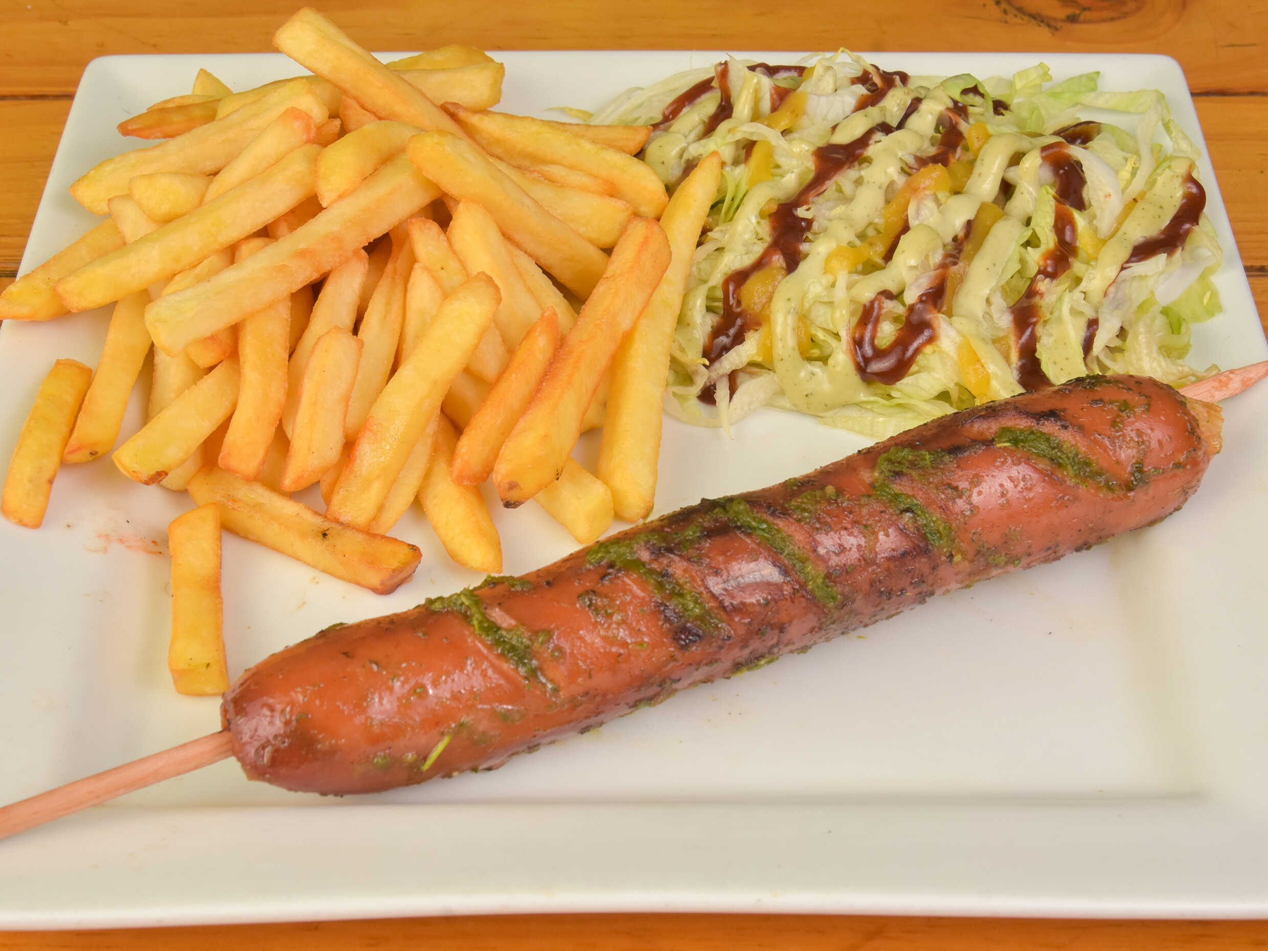 Chorizo acompañado de papa francesa y deliciosa ensalada de batavia bañada en salsa verde, piña y bbq.
