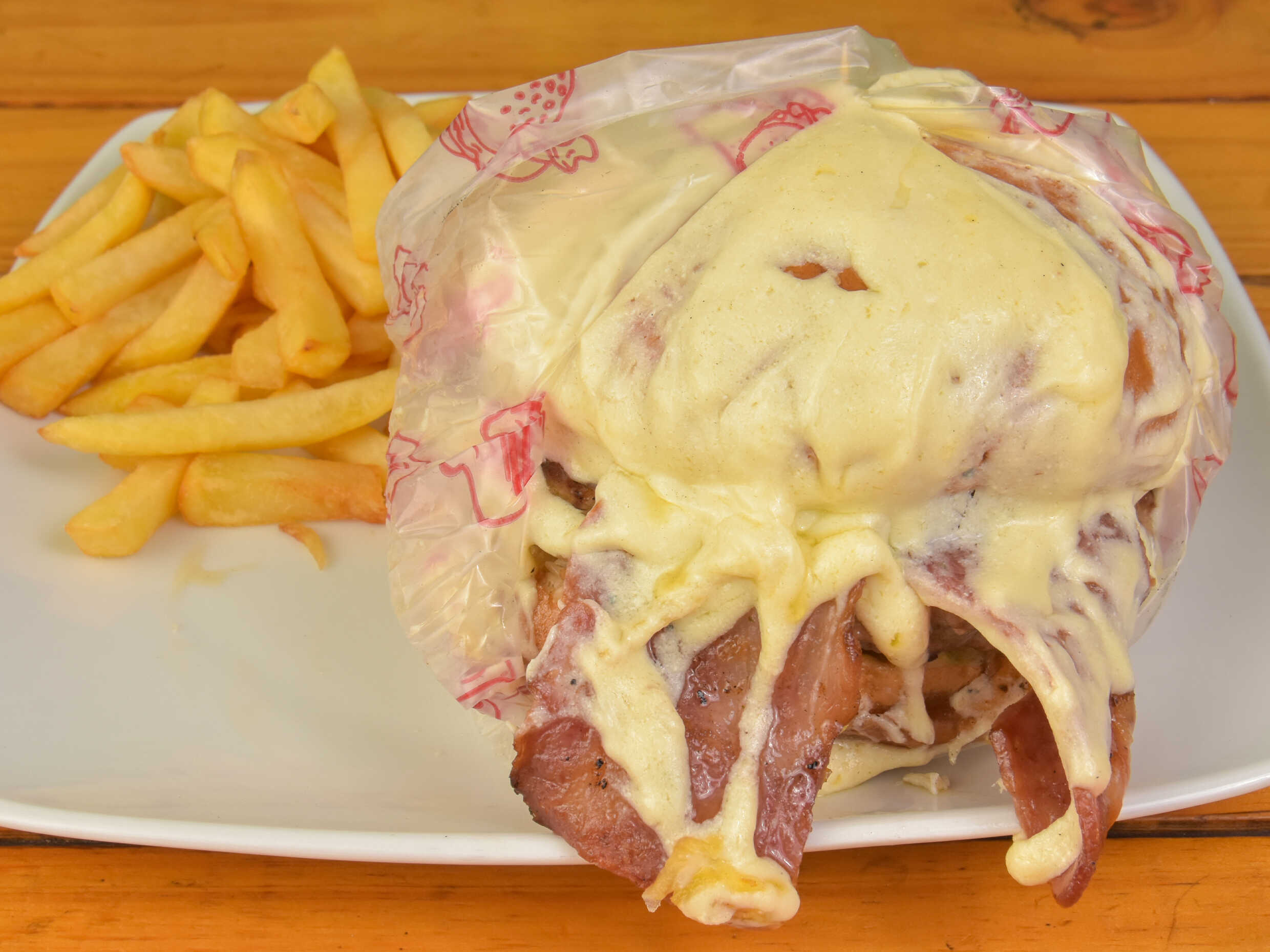 Pan, carne de hamburguesa especial, tocineta, lechuga tomate y cebolla, toda cubierta de queso, acompañada de papas a la francesa.