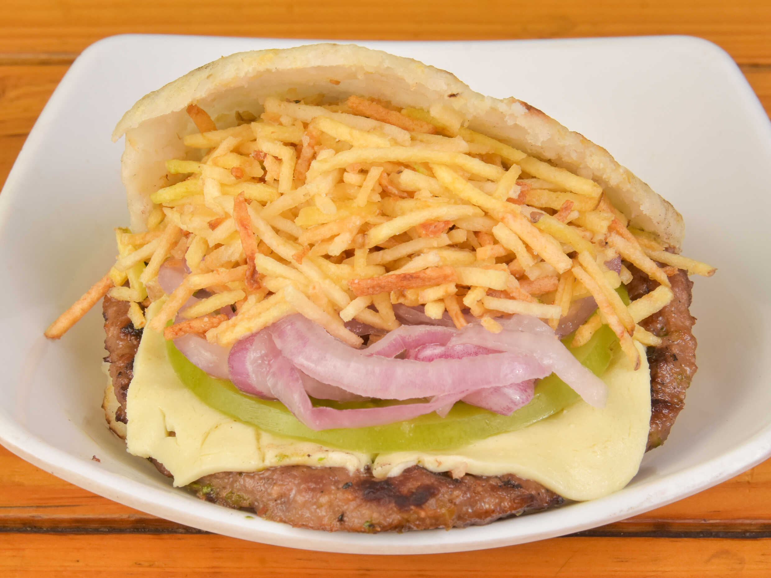 Arepa de maíz rellena de carne de hamburguesa, queso, cebolla, tomate y ripio de papa.