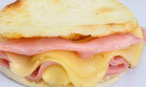 Arepa de maíz acompañada de jamón y queso.