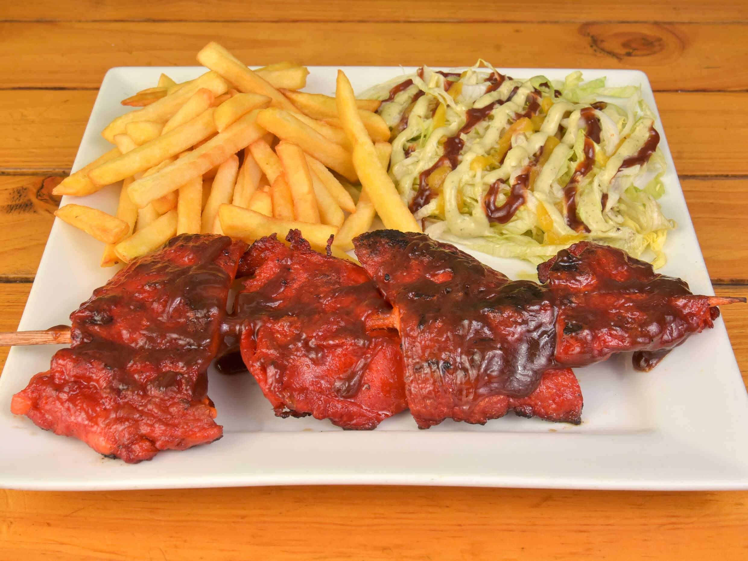 Costilla ahumada a la BBQ, acompañada de papa francesa y deliciosa ensalada de batavia bañada en salsa verde, piña y bbq.