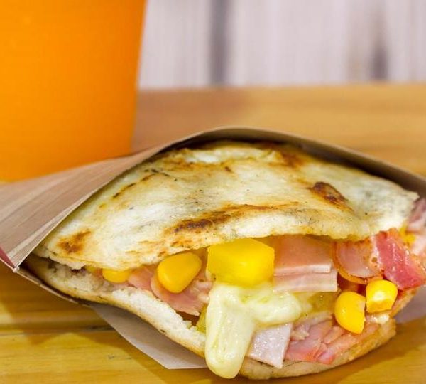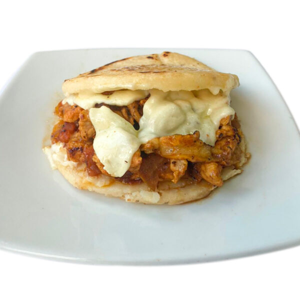 Arepa de maíz, rellena de pollo, salchicha, maicitos y queso.