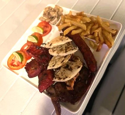 Porciones de 100 g de carne de cerdo, res, pollo, chorizo, costilla ahumada, chicharrón, papita a la francesa, tomate y limón. Para 4 personas.