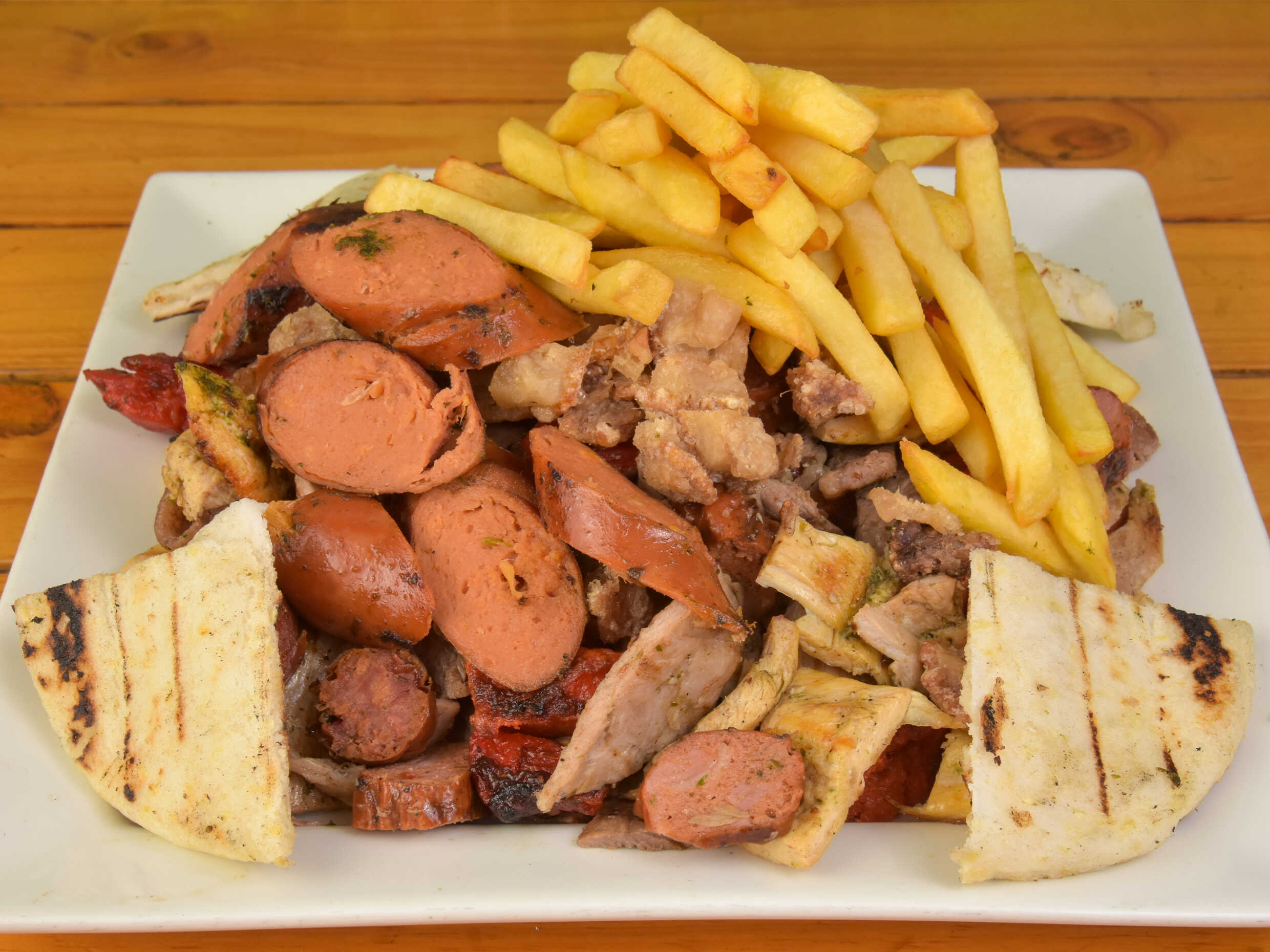Porciones de 100 g de carne de cerdo, res, pollo, chorizo, costilla ahumada, chicharrón, papita a la francesa, tomate y limón. Para 2 personas.