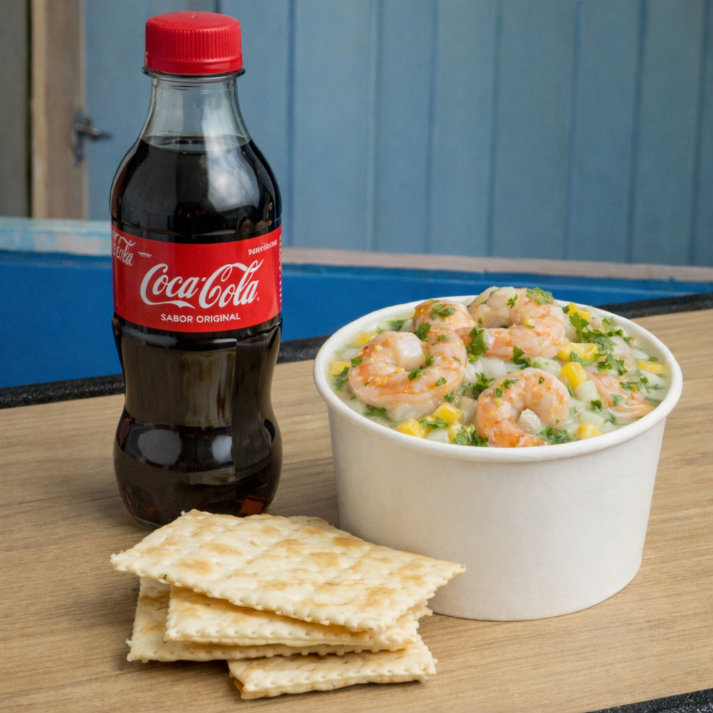 Ceviche de camarón grande al estilo colombiano, preparado con camarón fresco, marinado en limón natural, salsa rosada, cebolla blanca y cilantro, con el sabor casero y el toque especial de la casa. Acompañado de galletas Saltina en presentación personal y bebida a elección.