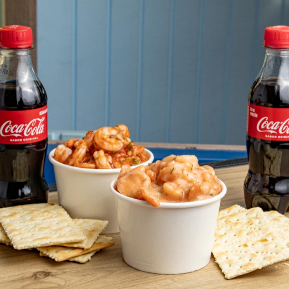 2 Ceviches de camarón grandes, sabor a elección. Acompañado de 2 galletas Saltina en presentación personal y 2 bebida a elección.