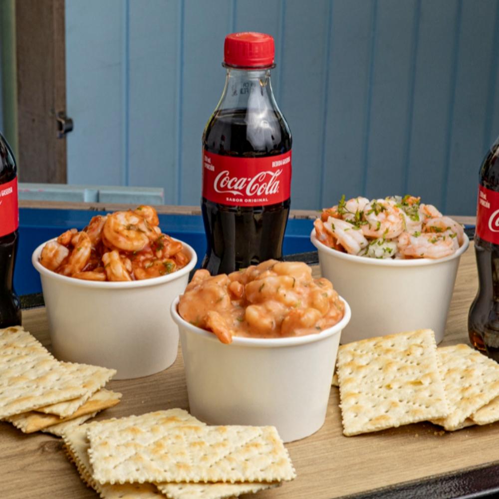 3 Ceviches de camarón grandes, sabor a elección. Acompañado de 3 galletas Saltina en presentación personal y 3 bebida a elección.