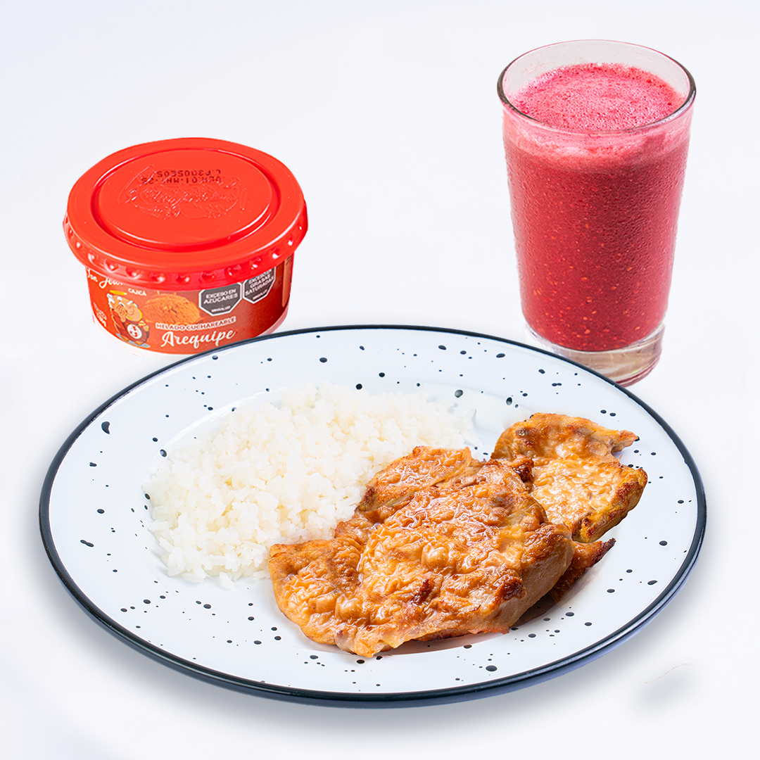 Media Chuleta, Medio Arroz con Pollo, Porción de Francesa con Bebida en Botella.