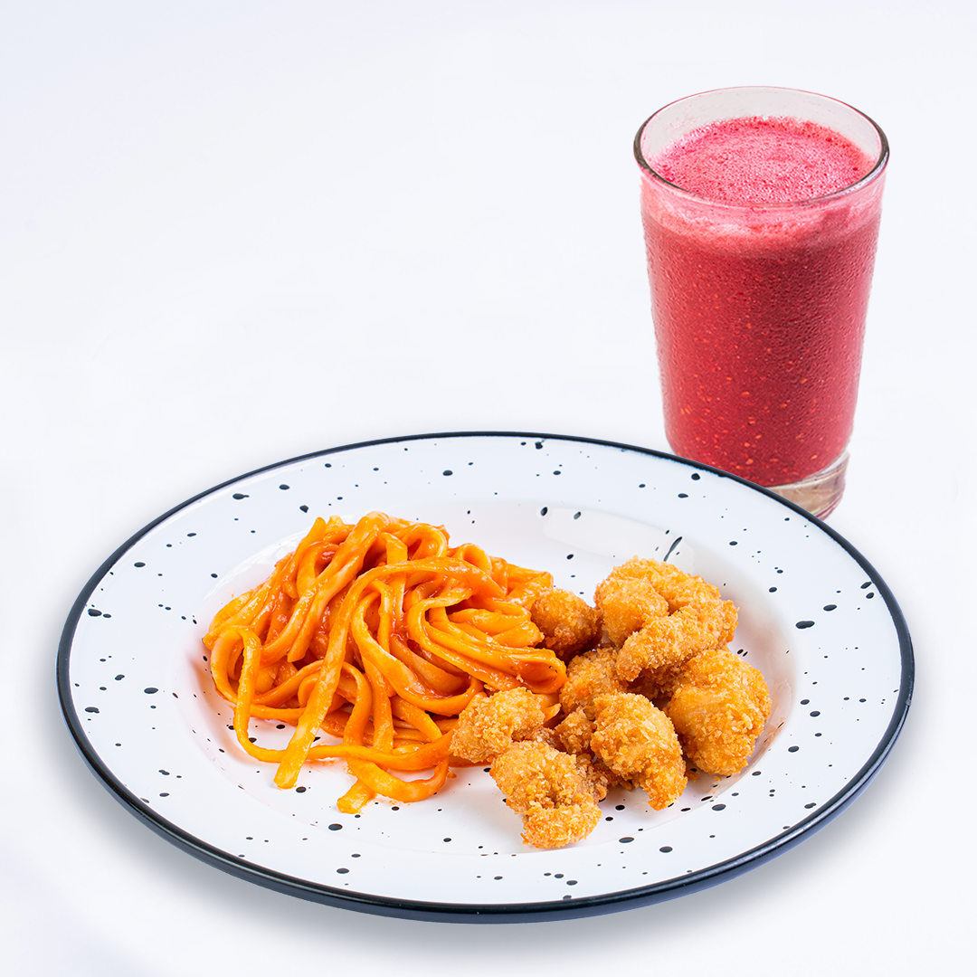 100 grs trocitos pollo apanados + Francesa o Fetuccini o Arroz Blanco o totopos + Jugo 16 onzas (Mora o Mango).