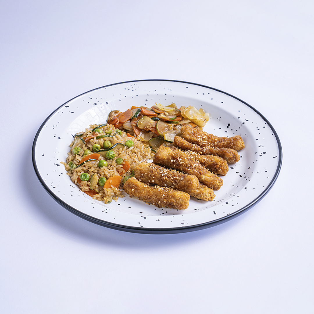 Julianas de chuleta de cerdo apanadas bañadas con salsa agridulce + Arroz al wok + 1 Acompañamiento entre vegetales al wok o francesa.