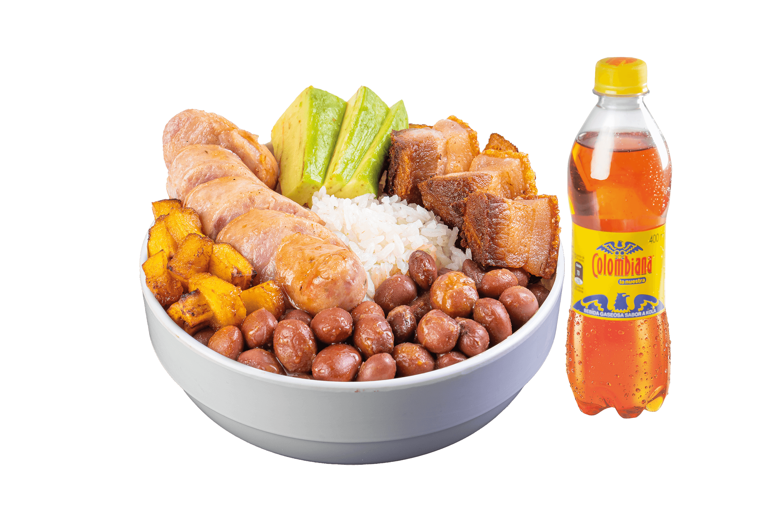 Frijol y arroz blanco + chorizo en rodajas + julianas de aguacate + chicharrón crocante + cubos de plátano maduro + 1 bebida personal