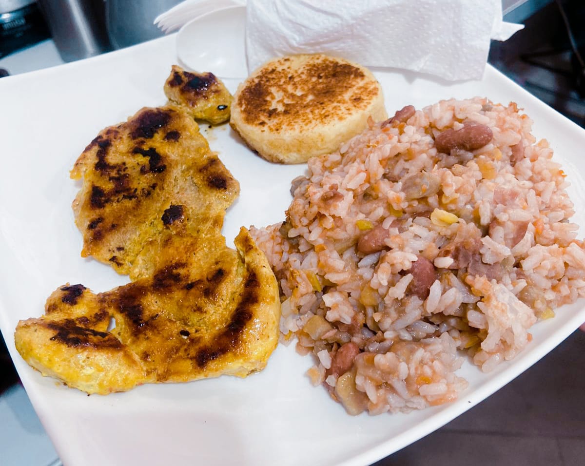 calentado de frijoles con arroz y pechuga asada ,arepa y café