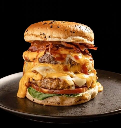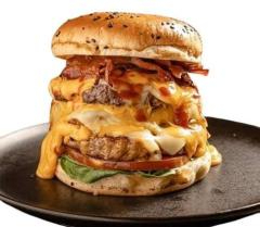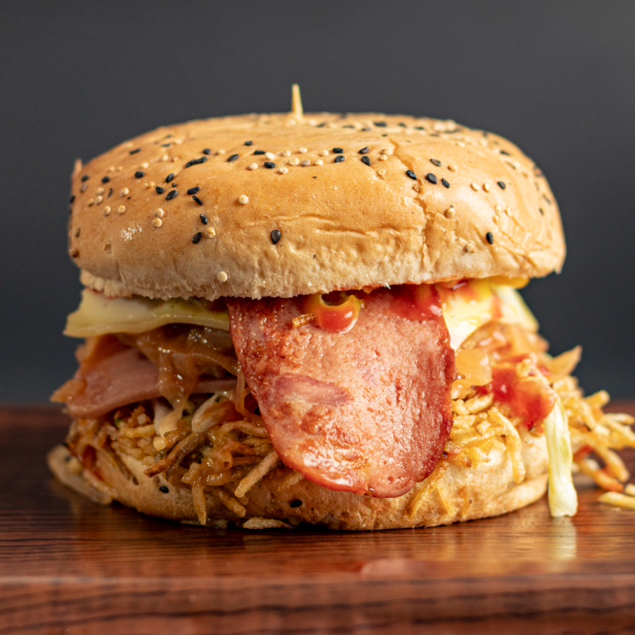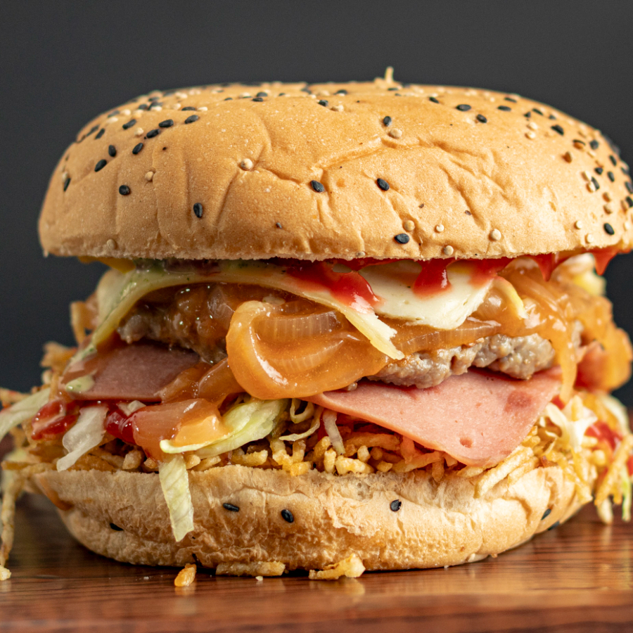 Pan, lechuga, tomate, ripio, doble carne de hamburguesa, jamón, cebolla caramelizada, tocineta, doble queso, salsa de la casa.