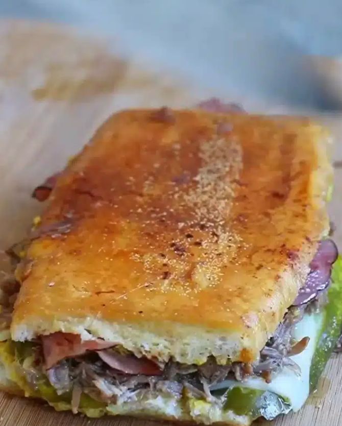 Pan, pollo y carne desmechada, tocineta, cebolla, ripio, triple queso, salsa de la casa.