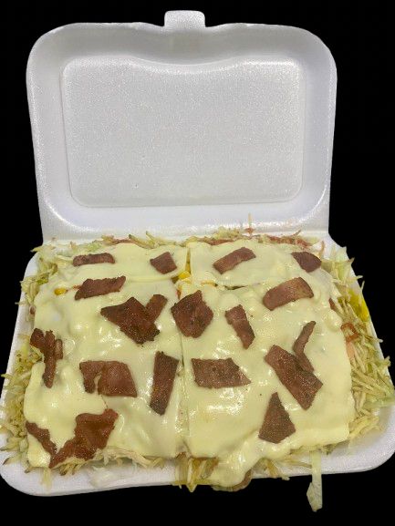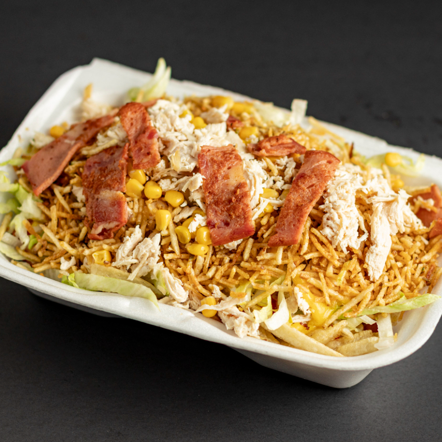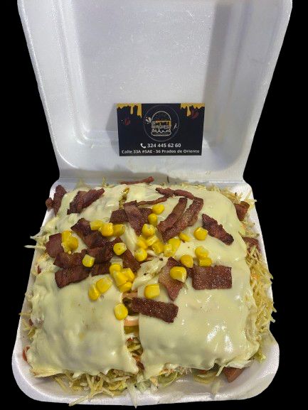 Papas a la francesa, salchicha, lechuga, pollo desmechado, ripio, maicitos, tocineta, salsa de la casa, queso. Para dos personas maximo.