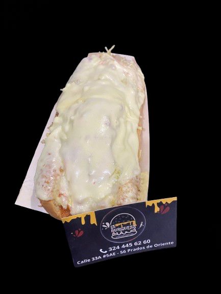 Pan, salchicha, cebolla, ripio, tocineta, carne y pollo desmechado, triple queso, salsa de la casa.