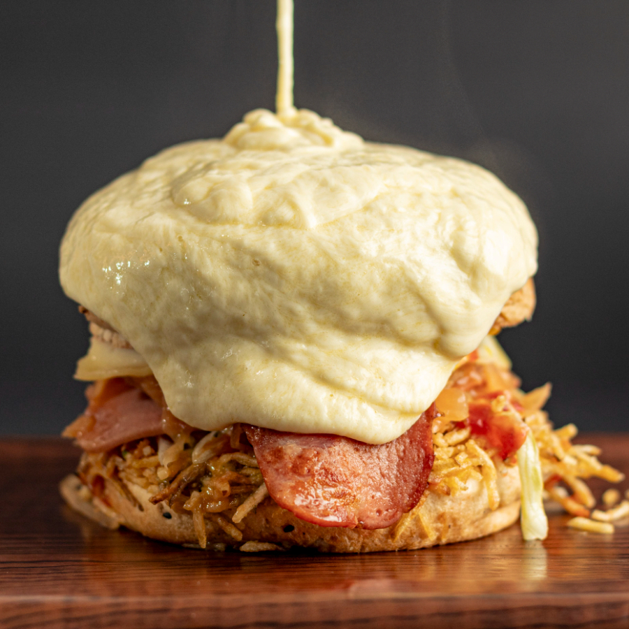 Pan, lechuga, tomate, ripio, carne de hamburguesa, jamón, cebolla caramelizada, tocineta, 5 quesos, salsa de la casa.