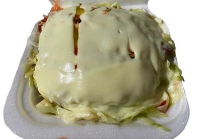 Pollo desmechado, carne desmechada, carne de hamburguesa, jamón, queso, lechuga, cebolla y tomate acompañado de nuestra deliciosa salsa de ajo de la casa.