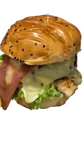 Pan, tomate, lechuga, ripio, carne de hamburguesa, queso, salsa de la casa, jamón, cebolla caramelizada.