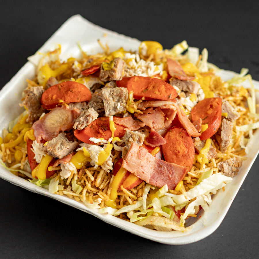 Papas a la francesa, salchicha, lechuga, ripio, carne de hamburguesa, pollo desmechado, tocineta, chorizo, queso, salsa de la casa.