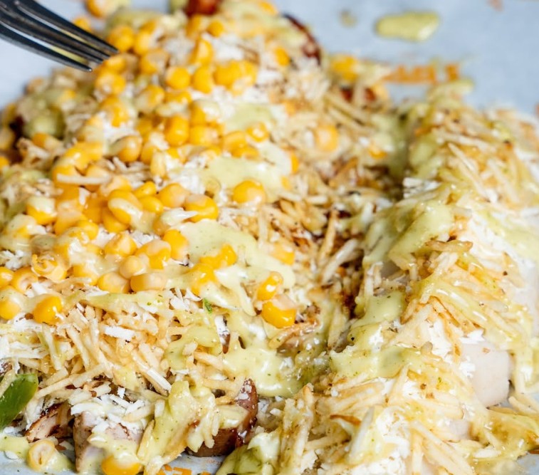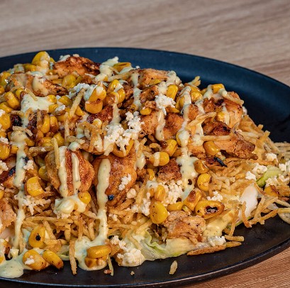 Papa francesa, maicitos, queso gratinado, ripio de papa, filete de pollo, tocineta ahumada, salsa de maíz.