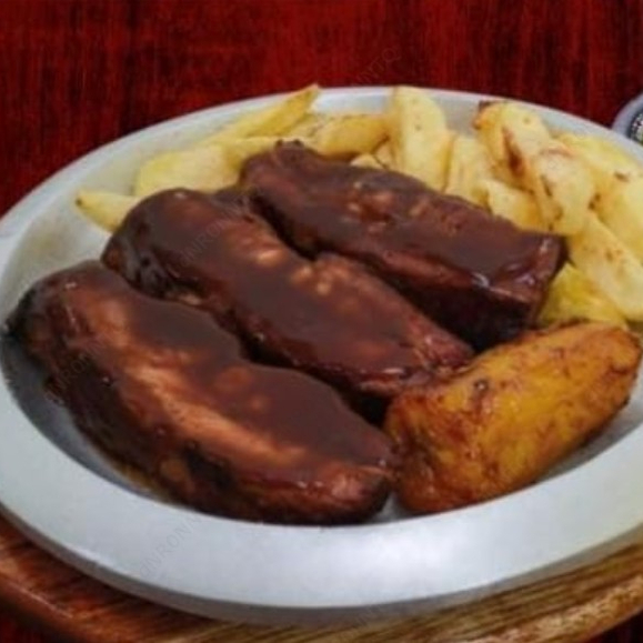 Bandeja de costilla de cerdo 3 unidades, bañadas en BBQ acompañadas de papa francesa, ensalada y salsa de la casa.